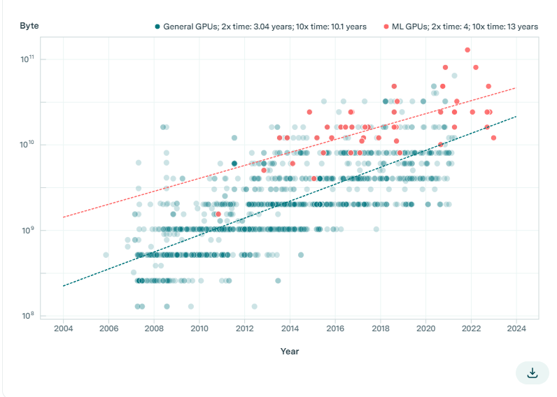 如人们所预期的那样,在内存容量和带宽方面,ML硬件超过了中位的GPU。然而,即使在这方面,这些指标的增长速度也一直落后于计算性能的增长速度(每2.3年翻一番)。这一趋势表明,对于大规模ML应用而言,内存正在成为一个日益关键的瓶颈。当前的架构改进,比如引入更少位的数字表征,可能会减轻这种内存限制。然而,如果不加快发展,这一内存瓶颈将在未来几年继续影响整体性能。[15]