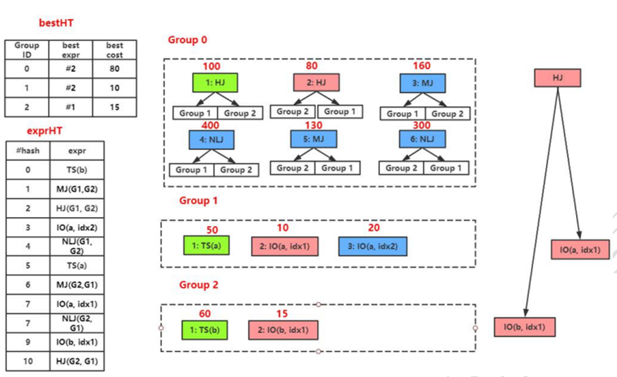 因此,实际的优化完成次序是 Group 1 -> Group2 -> Group 0。在优化每个 Group 时,依次优化每个组员;在优化每个组员时,依次递归地优化每个子节点。依次估算当前组里每个表达式 e 的代价 cost(e),选择最低得代价结果保存在 bestHT 中。优化结束时,查询 Join(a,b)对应的 Memo 结构体,获取最低的执行计划。