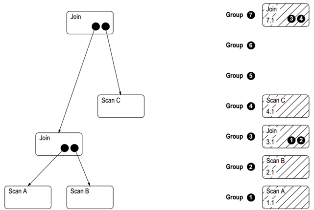 Cascades 首先将整个 Operator Tree 按节点拷贝到一个 Memo 的数据结构中,Memo 由一系列的 Group 构成,每个算子放在一个 Group,对于有子节点的算子来说,将原本对算子的直接引用,变成对 Group 的引用。