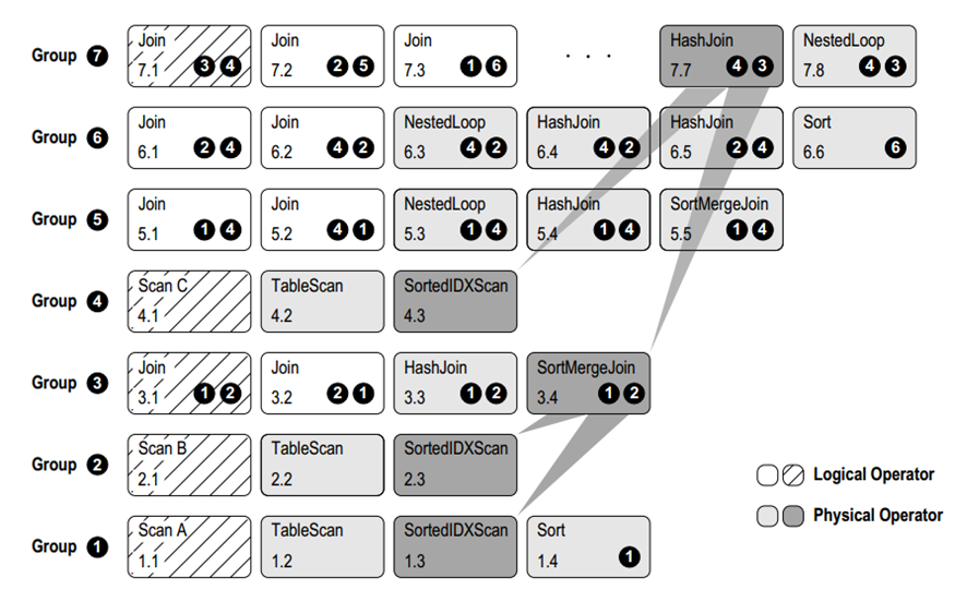Group:表示等价 Expression 的集合,即同一个 Group 中的 Expression 在逻辑上等价。Expression 的每个子节点都是以一个 Group 表示的。一个逻辑算子可能对应多个物理算子,例如一个逻辑算子 Join(a,b),它对应的物理算子包括{HJ(a, b), HJ(b, a), MJ(a, b), MJ(b, a), NLJ(a, b), NLJ(b, a)}。我们将这些逻辑上等价的物理算子称为一个 Group(组)。注:HJ 表示 HashJoin 算子,MJ 表示 MergeJoin 算子,NLJ 表示 NestLoopJoin 算子;