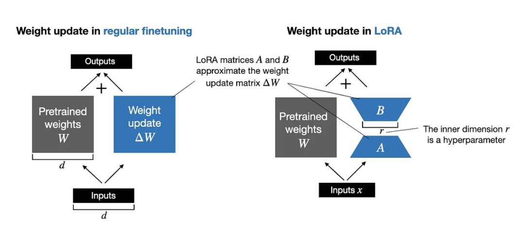 Hu等人提出的LoRA方法将权重变化ΔW分解为一个低秩表示(https://arxiv.org/abs/2106.09685)。因此,LoRA方法能够在训练过程中直接学习权重变化ΔW的分解表示,而不需要显式计算ΔW,从而节约了计算资源,如下图所示。