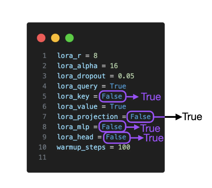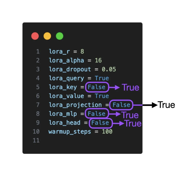 6. 如果你正在使用LoRA,应将其应用于所有层(而不是仅仅应用于Key和Value矩阵),以最大化模型性能。