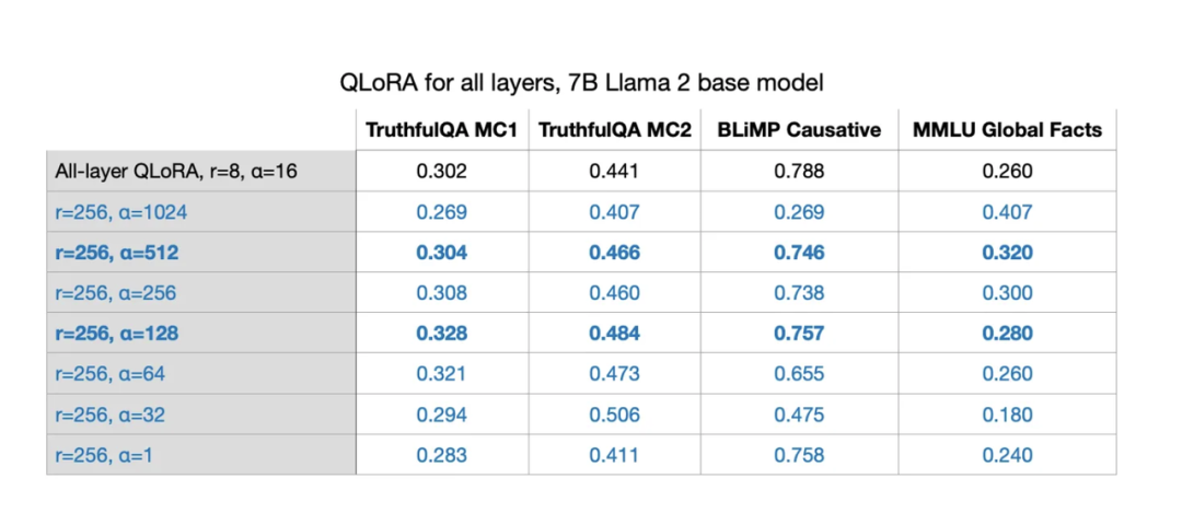 很遗憾,对于选择一个好的r,我并没有好的启发式方法,这是一个需要针对每个LLM和每个数据集进行探索的超参数。我怀疑过大的r可能会导致过拟合。另一方面,较小的r可能无法涵盖数据集中的多样化任务。换句话说,我认为数据集中任务越多样,r就应该越大。例如,如果我只需要一个执行基本的两位数运算的模型,那么很小的r可能就已经足够了。不过,这只是一种假设,还需要进一步研究。