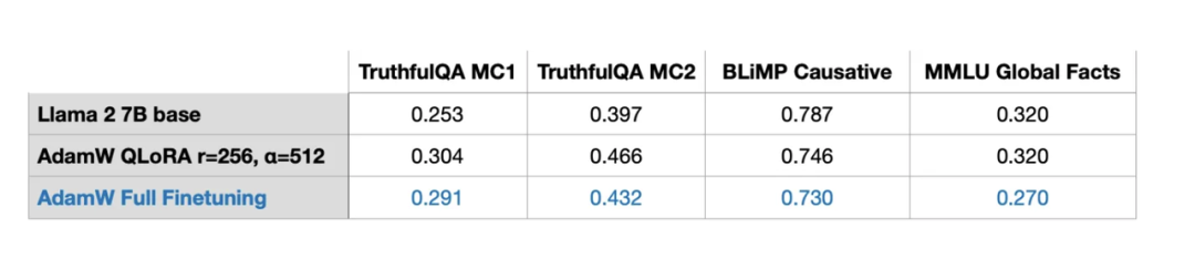 我并没有进行任何RLHF实验,但我考虑过进行全微调(full finetuning)。全微调至少需要2个GPU,每个GPU的完成时间为3.5小时,内存占用为36.66GB。然而,由于过拟合或次优超参数,基准结果并不理想。