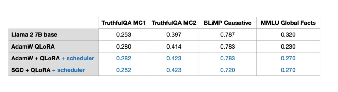 3. 微调LLM时,优化器的选择并不是我们关注的重点。虽然单独使用随机梯度下降(SGD)效果不佳,但无论是选择AdamW、带调度器的SGD或者带调度器的AdamW,它们对模型的最终结果影响都不大。