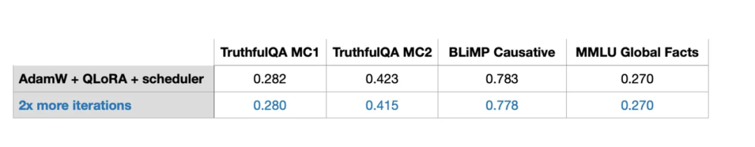 结论是,对指令微调进行多轮训练作用不大,可能会导致结果恶化。我在1000个示例的LIMA数据集上也观察到了同样的情况。这种性能下降可能是由过拟合导致的,这需要进一步的研究。