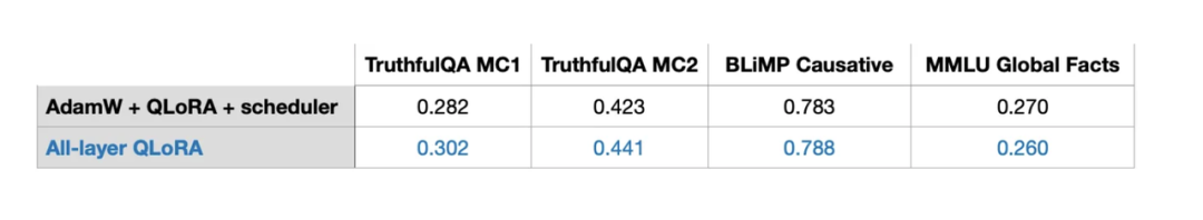 我只探索了两种设置:(1)仅启用Query和Value权重矩阵的LoRA,以及(2)启用所有层的LoRA。在未来的实验中,可能值得探索其他组合。例如,了解激活投影层的LoRA是否真的有益,这将是一个有意思的研究方向。