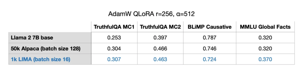 在LIMA上使用最佳配置(r=256,alpha=512)时,我获得了与50倍更大的Alpaca数据集相当、甚至更好的性能。