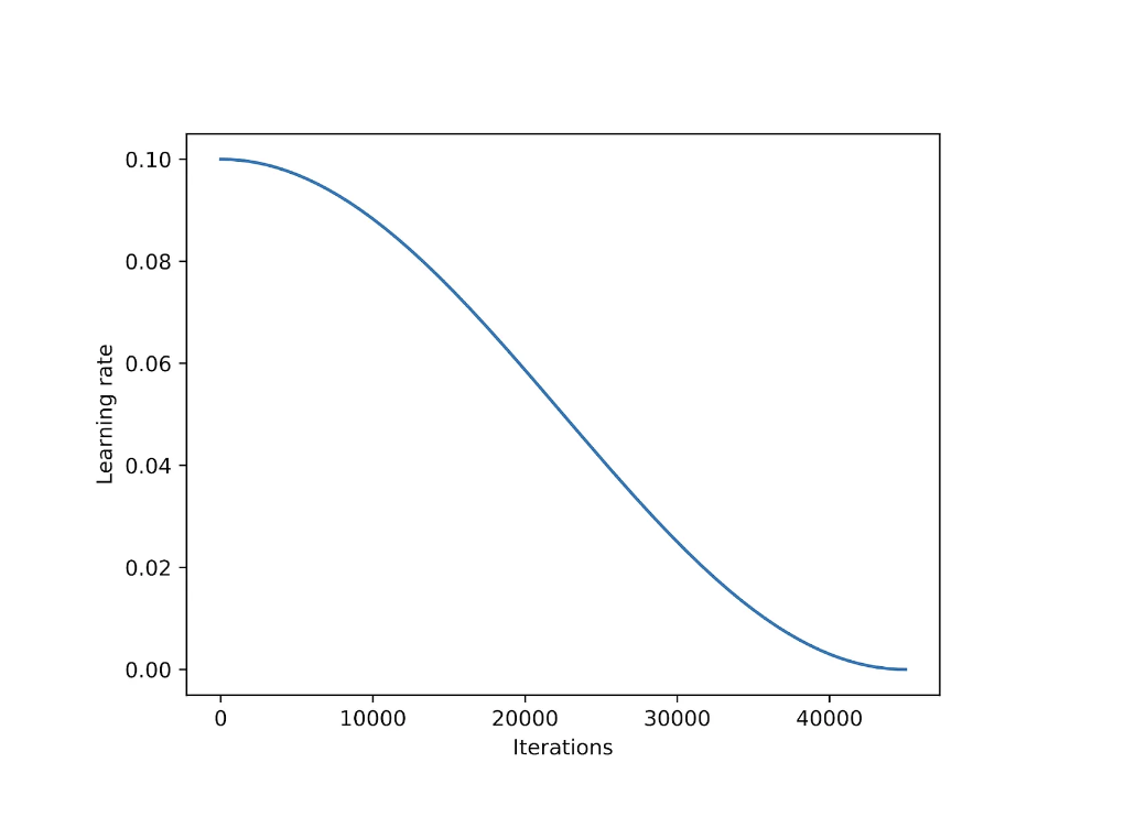 余弦退火(Cosine annealing)是一种学习率调度器,它根据余弦曲线调整学习率。它从一个较高的学习率开始平滑地递减,以一种类似余弦函数的方式逼近零点。一个常用的变体是半周期变体,在训练过程中只完成半个余弦周期,如下图所示。