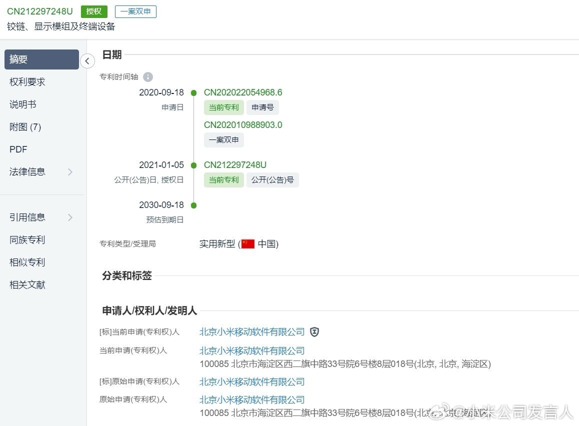 且龙骨转轴于 2020 年 9 月18 日申请专利,并于 2021 年 1 月 5 日获得专利授权,在 2023 年 8 月于 XiaomiMIXFold 了上首发应用。双旋水滴较链则于 2019 年 12 月 13 日申请的专利,2021 年 6 月 18 日才公开。“由此可知,余承东先生的言论,完全不符合事实。”