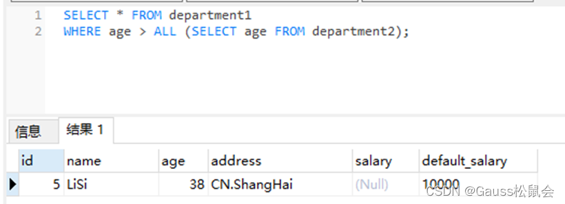 如果所有的比较结果都为真值(包括数组不含任何元素的情况),则ALL的结果为true。 如果存在一个或多个比较结果为假值,则ALL的结果为false。 如果数组表达式产生一个NULL数组,则ALL的结果为NULL。如果左边表达式的值为NULL ,则ALL的结果通常也为NULL(某些不严格的比较操作符可能得到不同的结果)。另外,如果右边的数组表达式中包含null元素并且比较结果没有假值,则ALL的结果将是NULL(某些不严格的比较操作符可能得到不同的结果), 而不是真。这样的处理方式和SQL返回空值的布尔组合规则是一致的。 示例:(基础表department1、department2见上文截图)