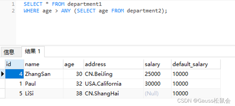 如果对比结果至少获取一个真值,则ANY的结果为true。 如果对比结果没有真值,则ANY的结果为false。 如果结果没有真值,并且数组表达式生成至少一个值为null,则ANY的值为NULL,而不是false。这样的处理方式和SQL返回空值的布尔组合规则是一致的。 示例:基础表:部门1、部门2