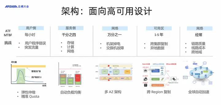 从整个系统的角度来看,数据从用户端产生到服务端,可能会经历突发的流量情况。在整个网络中,数据可能会经历机器硬件故障和网络链路传输问题,包括从各个可用区采集数据并将其完整存储的过程。我们还需要面对低概率的不可用事件。为了确保数据链路的完整性,我们通过弹性伸缩、精确 Quota 管理、自动负载均衡和多 AZ 架构设计,以及跨 Region 复制能力来提供服务。此外,SLS 和网络团队合作,通过全球自动加速技术,确保设备和数据无论位于全球哪个区域,都能够安全高效地被采集到系统中。