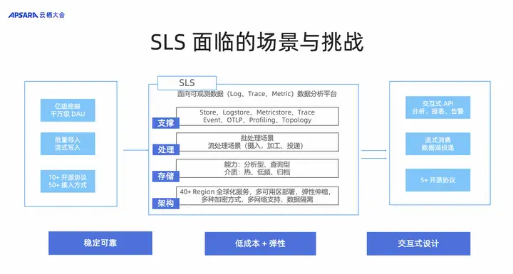 面向亿级终端、千万级 DAU 数据,我们需要同时应对各种可观测分析、安全分析、大数据系统和大模型的场景和挑战,SLS 如何满足用户需求并提供面向可观测数据分析平台能力?日志服务 SLS 研发负责人、阿里云资深技术专家简志认为,系统的稳定可靠、弹性+低成本、交互式设计是关键,并从架构、存储、处理引擎和上层的应用支撑能力这四个层次解析了SLS 在技术设计方面如何化解这个问题。