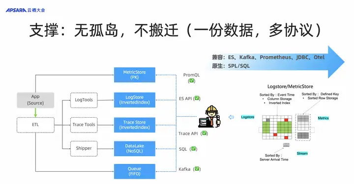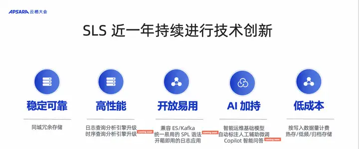 阿里云日志服务 SLS 全面拥抱云原生和 AI,近一年持续进行技术创新,此次云栖大会上发布了在稳定可靠、高性能、开放易用、AI 加持、低成本等五个方面的全面升级。深度解读 SLS 的技术积累,面向高可用设计的架构, 针对 Telementry 场景构建的存储,支持流处理和批处理场景的处理引擎,以及一份数据多协议的上层应用支撑。未来,我们还将持续深耕基于 SLS 的可观测分析创新,为用户提供更好的云原生可观测数据分析平台服务。