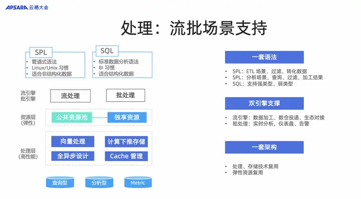 而 SLS 的存储模型充分考虑了各种数据访问的需求,无论是顺序访问、随机检索还是批量访问。通过两个接口,即SQL 和 SPL,我们都可以轻松地获取数据。因此,用户使用 SLS 只需要通过一套 API,就能够满足对于 Log、Metric、Trace 数据和 Kafka 数据等所有分析场景的需求。