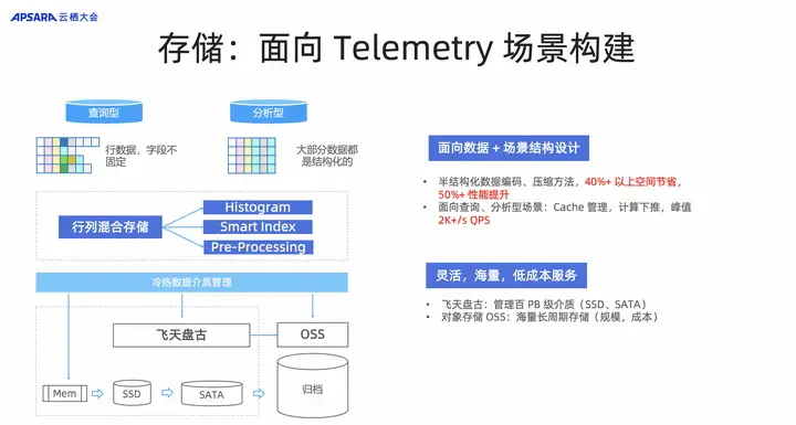 在数据采集到系统后,我们面临一个问题。尽管这类遥测数据(Telementry Data)本身的信息量并不大,但通过大数据技术,我们可以将这些数据进行整合,从而获得一个完整的视图。当然,为了存储这些数据,我们必须将存储成本降低到一定程度。在阿里巴巴操作系统中,我们利用了两个重要的模块来实现这一目标,分别是飞天盘古和对象存储(OSS)。通过飞天盘古和 OSS 的灵活、海量和低成本存储服务,我们可以将热数据存储在更易访问的介质上,支持冷热数据介质管理,降低了海量 OpenTelemetry 数据存储的成本。