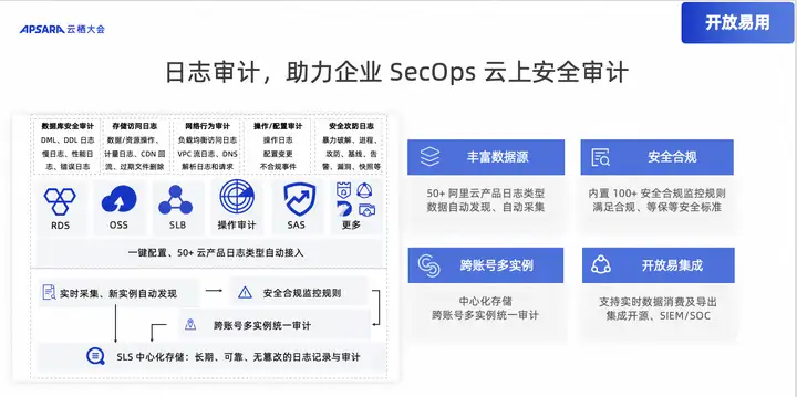 - 开放易集成:借助 SLS 查询分析、加工、报表、告警、导出等功能,完整支持审计场景下分析告警对接需求。支持开源、三方 SIEM/SOC 对接