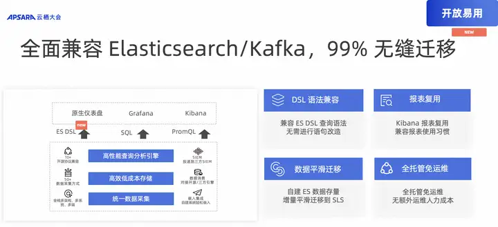 此外,SLS 开放兼容,支持 ElasticSearch、Kafka、Prometheus、CK 99% 情况下无缝迁移。