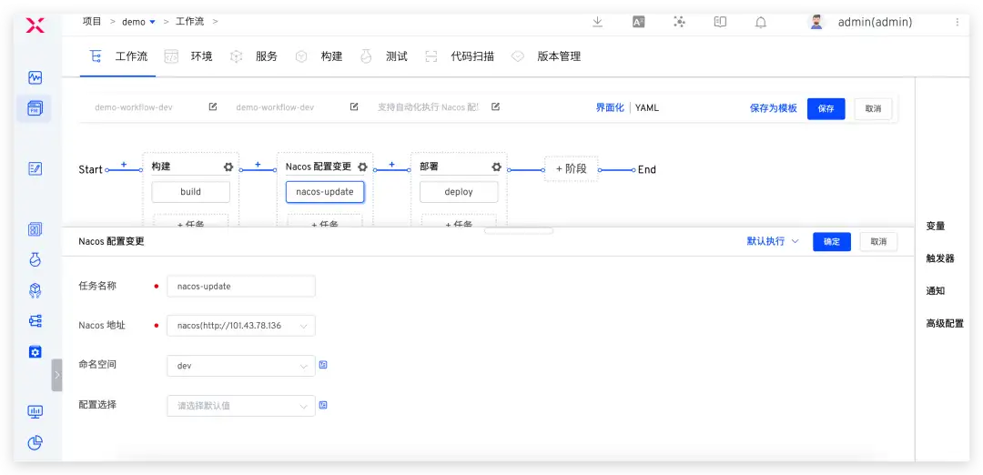 管理员在 Zadig 中集成 Nacos 配置管理系统,配置工作流 「Nacos 配置变更」任务,即可实现配置的自动化变更、帮助工程师方便的完成配置的一致性传递。