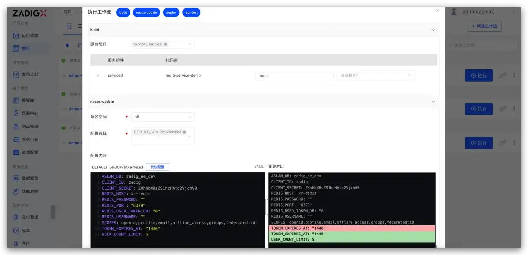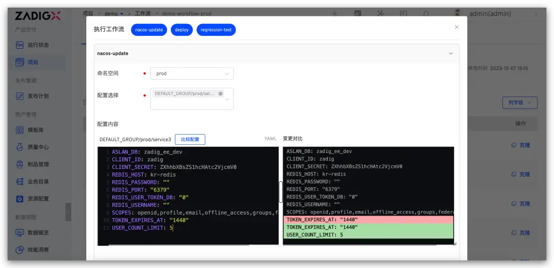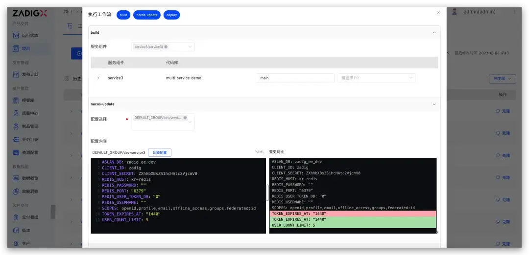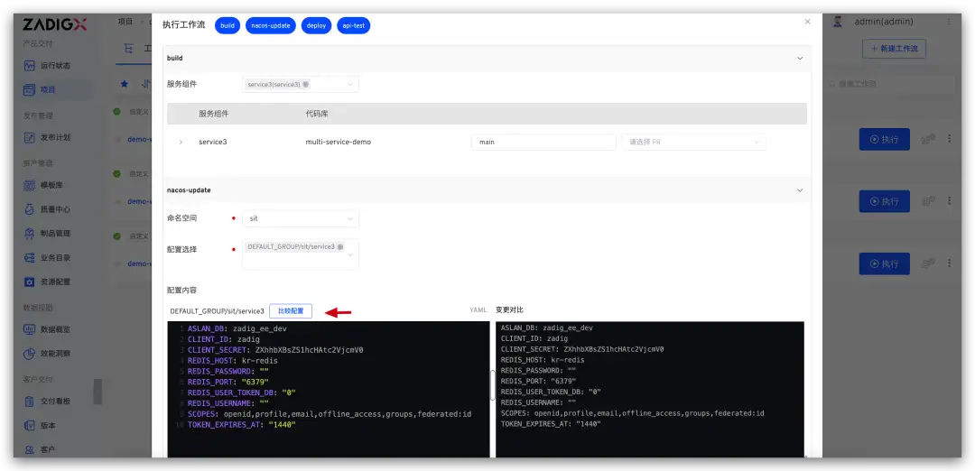 Zadig 工作流支持编排 Nacos 配置变更任务,实现业务和配置的自动化、高效变更。支持多环境配置比对和单环境变更前后对比等能力,有助于确保配置在开发、测试和生产发布中的一致性传递,为生产发布过程提供稳定、安全和可靠的保障。