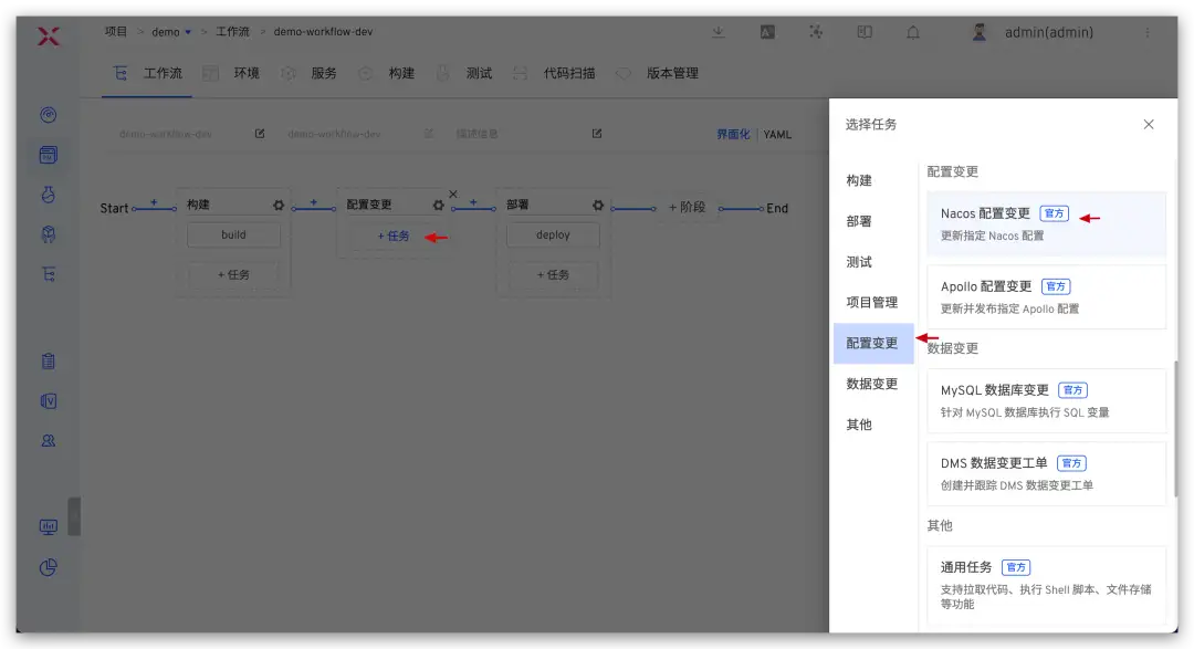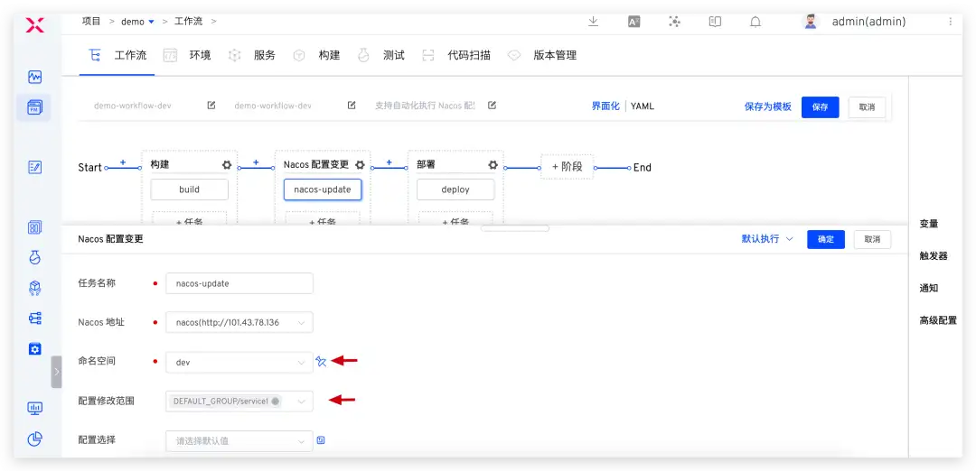开发工程师代码实现完毕后需要自测联调时,执行 demo-workflow-dev 工作流,选择需要更新的服务,在 Nacos 配置变更任务中选择要变更的配置并修改配置内容。