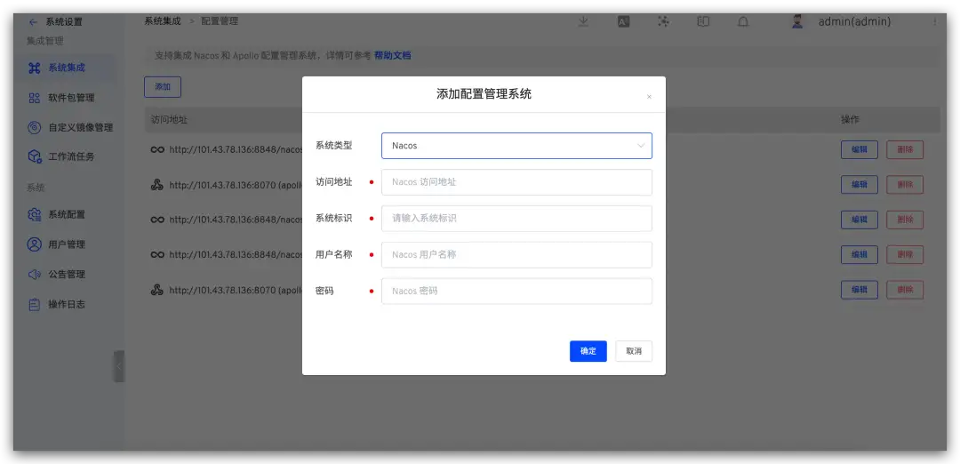 访问 Zadig 系统设置 > 集成管理 > 配置管理 > 添加配置管理系统:Nacos