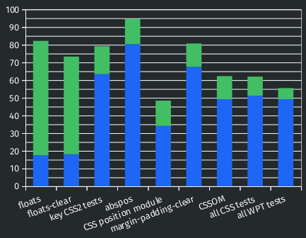 在Web Platform Tests的部分测试中,Servo的新布局引擎显示出了显著的进步。例如,在floats测试中,新布局引擎的通过率达到了82.2%,而在floats-clear测试中达到了73.3%。此外,Servo在Acid1测试中也通过了新布局引擎,并在CSS2 abspos、CSS2定位和CSS Position测试套件中取得了优于旧布局引擎的成绩。