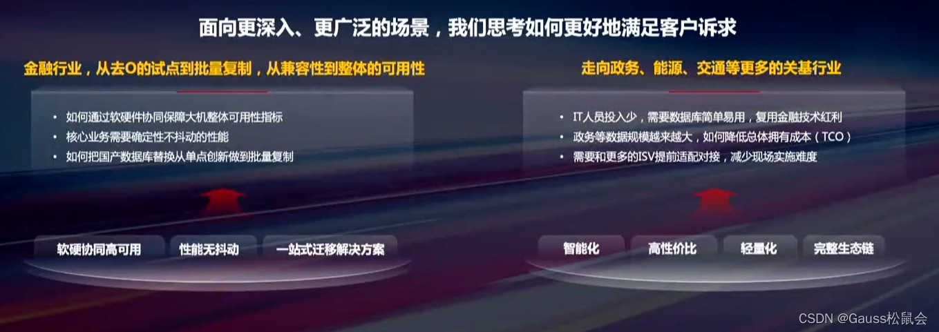 - 面向更深入、更广泛的场景,我们思考如何更好地满足客户诉求 随着GaussDB的成熟,未来GaussDB将向两个方向发展。第一是做深做透金融行业,一次性解决金融客户数字化转型和可持续发展的双重诉求;第二是从金融走向政务、能源、交通等更多关键信息基础设施行业,这也是一个新的使命。