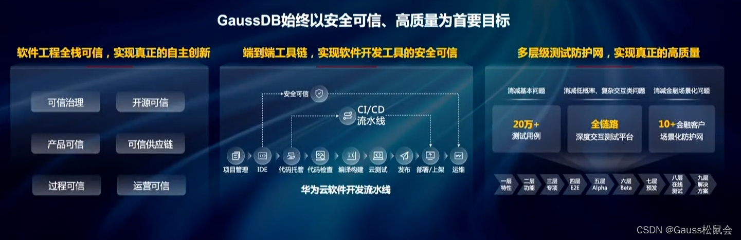 从产品定义、代码实现、开源治理到运营运维等各个环节,GaussDB基于华为软件工程全栈可信框架,实现了从结果可信到过程可信,做到了包括开发GaussDB软件的整个工具链在内的真正的自主创新。