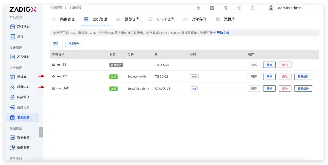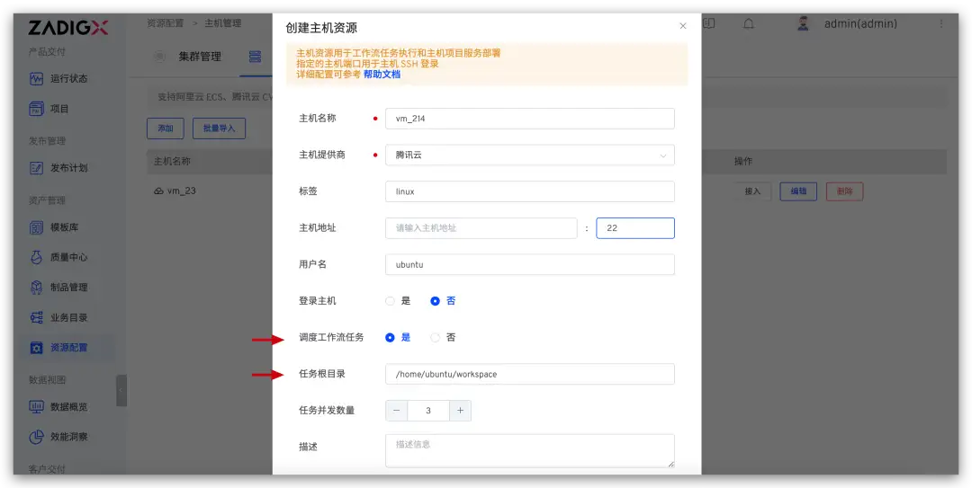 第一步:在 Zadig 上「资源配置」> 「主机管理」> 添加主机,填写以下必要的信息。