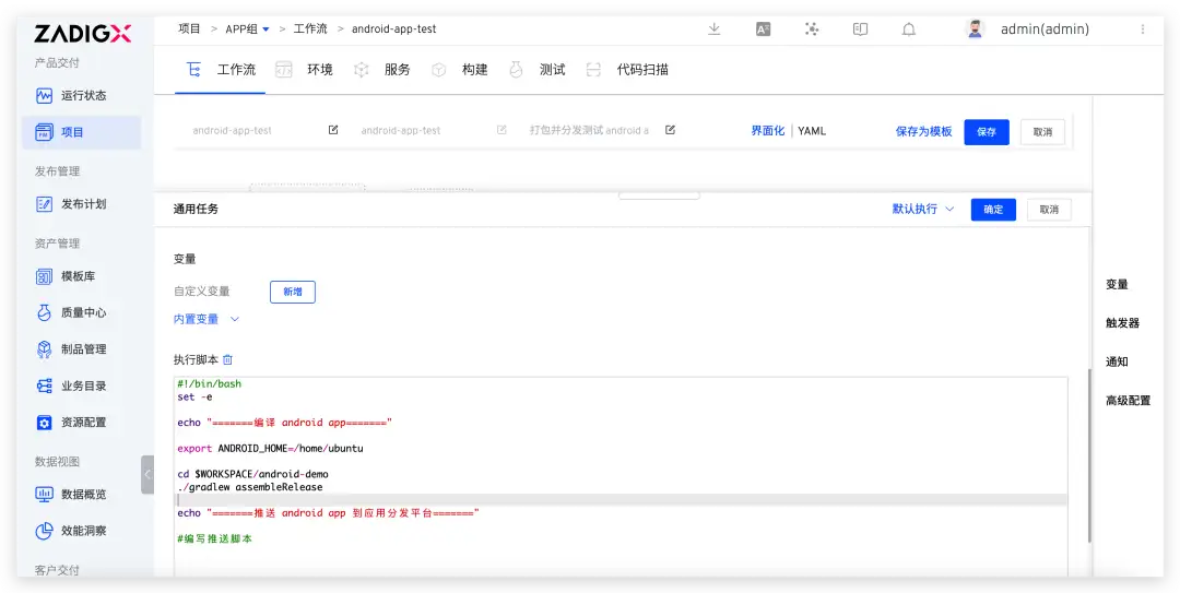 · 测试阶段:包括编译打包 Android App 和推送 App 到应用分发平台步骤