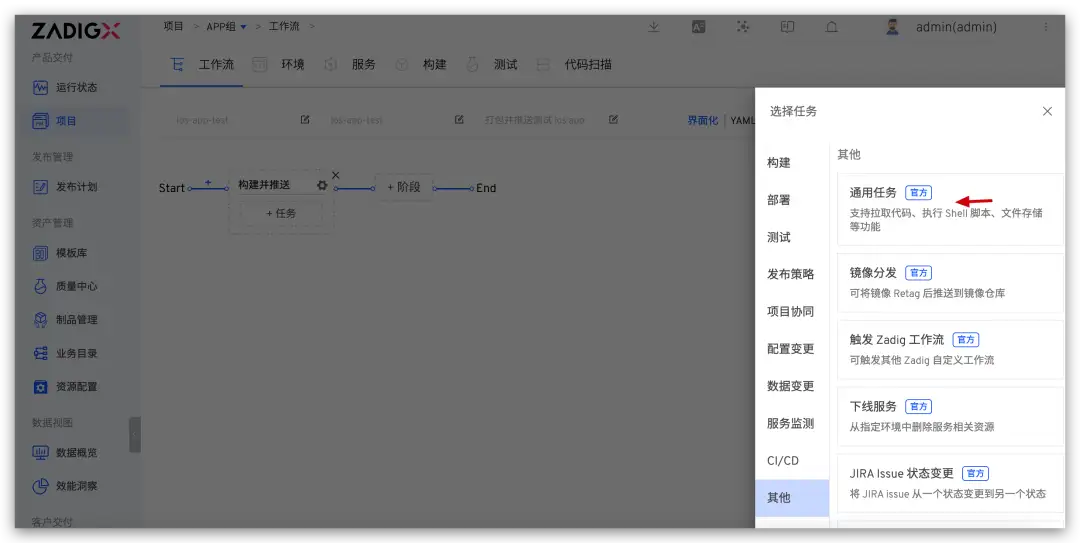 第一步:新建自定义工作流 > 添加「阶段」> 添加「任务」,选择「通用任务」