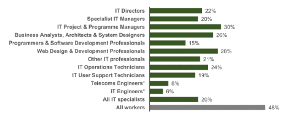 - 2022 年,女性 IT 专家从事兼职工作的可能性是男性的四倍多(即 13% 对 3%)——最常见的原因是她们不想从事全职工作。