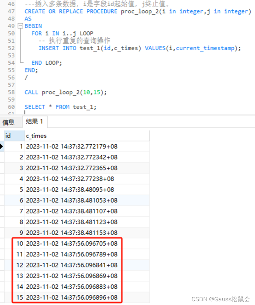 三、GaussDB中常用循环语句(语法 + 示例) 1、LOOP循环语句 LOOP循环是一个无限循环,直到显式地使用EXIT语句退出循环。在循环体内部,可以根据条件执行重复的查询操作。例如,可以使用IF语句在每次循环时检查条件,并执行相应的操作。