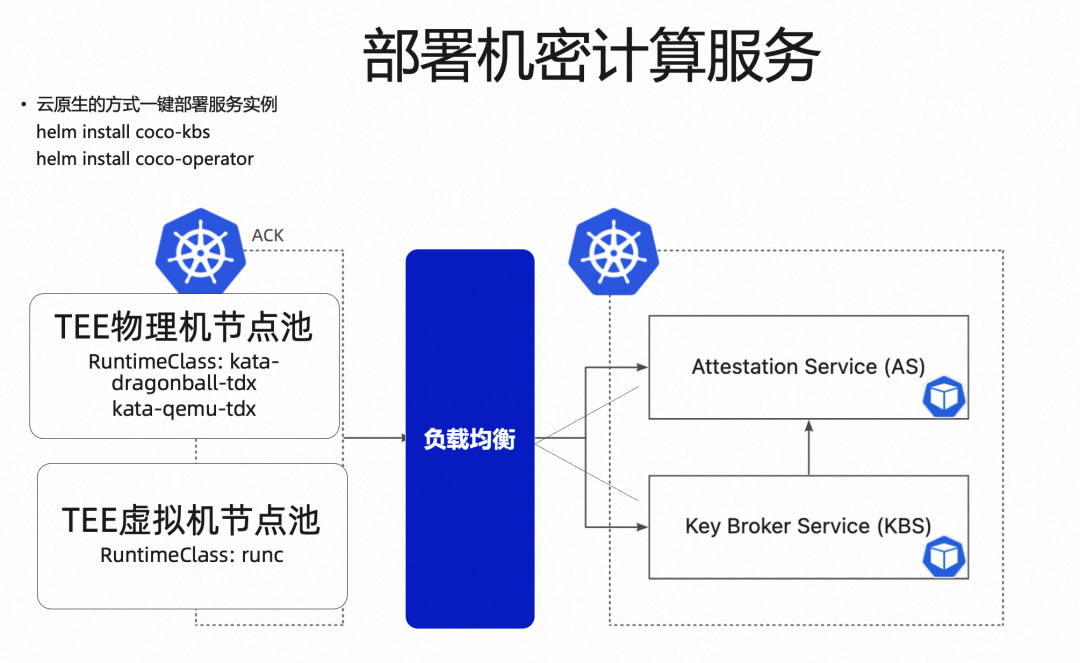 - 通过 ACK 应用市场,云原生的方式一键部署远程证明和代理服务实例,helm install coco-kbs。