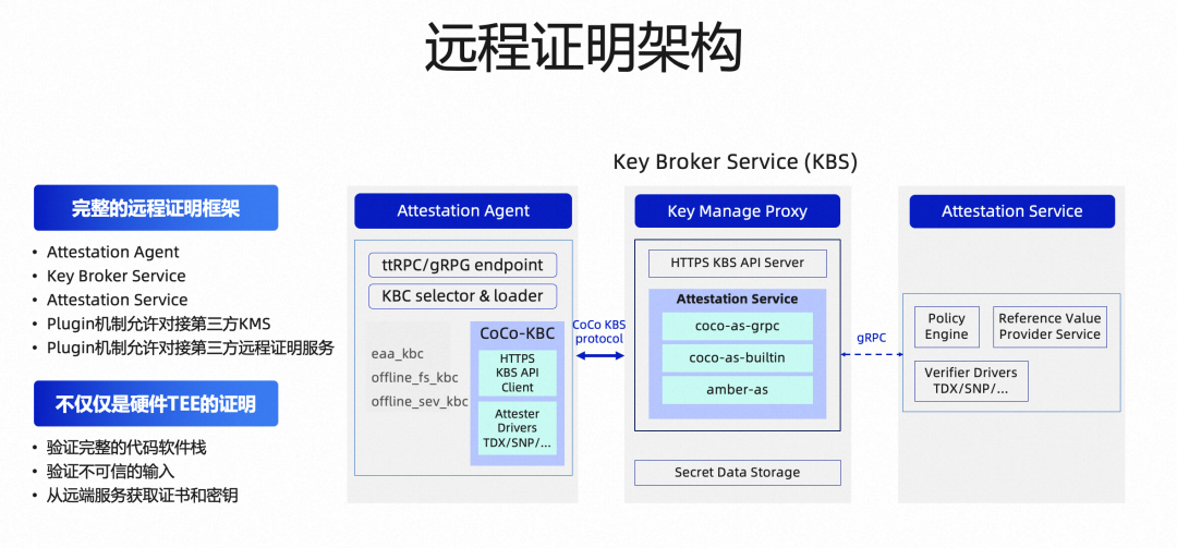 ACK 提供的多租户的远程证明服务提供了完整的租户级远程证明框架,用以支持建立用户对 TEE 从硬件到软件的全栈信任,从而实现注入密钥和证书注入等一系列关键的安全需求。达摩院操作系统实验室致力于研究远程证明架构对应用负载的完整可信,通过 Attestation Agent 运行在 TEE 内(这里的 TEE 主要包括机密虚拟机和机密沙箱内部)收集证据并发送给租户级服务 KBS,KBS 通过将证据转发给后端的 Attestation Service 对证据进行验证,然后向 TEE 内返回证明结果以及所需的秘密资源数据,从而达到对于应用负载,代码,配置,输入的安全度量。