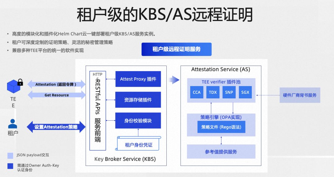 远程证明体系整体采用模块化和插件化设计,以统一的软件架构兼容多种 TEE 平台。KBS 通过 RESTful API 接收来自TEE或者租户的请求,在 KBS 内部我们实现了灵活的资源存储插件和 Attest Proxy 插件,从而允许在实际场景中对接不同的第三方存储服务和 Attestation Service。在后端的 Attestation Service 中,集成了 OPA 实现的策略引擎以支持租户深度定制的证明策略。通过 ACK 应用市场可以实现远程证明服务的组件化部署和定制化。