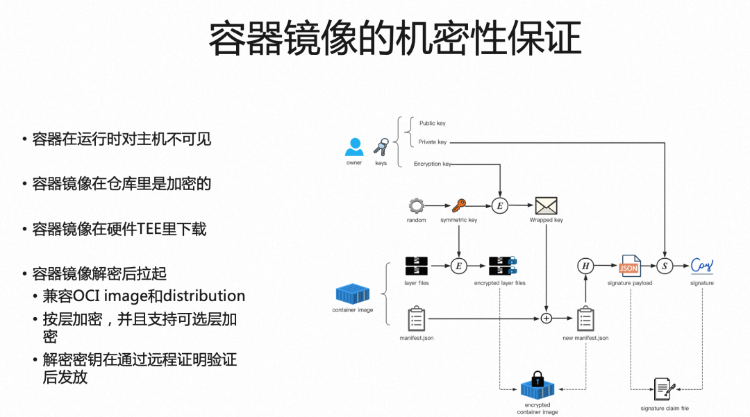 为了保护镜像的机密性和不可窥探性,容器在运行时需要对主机不可见,通过镜像加密保证容器镜像对服务提供商不可获取,容器镜像在硬件 TEE 里下载和解密对运维人员不可见,加密后的容器镜像支持 OCI 和 distribution,支持按层加密和可选层加密主要针对模型和私有代码的保护,解密密钥在通过远程证明验证后发放只对 TEE 可见。