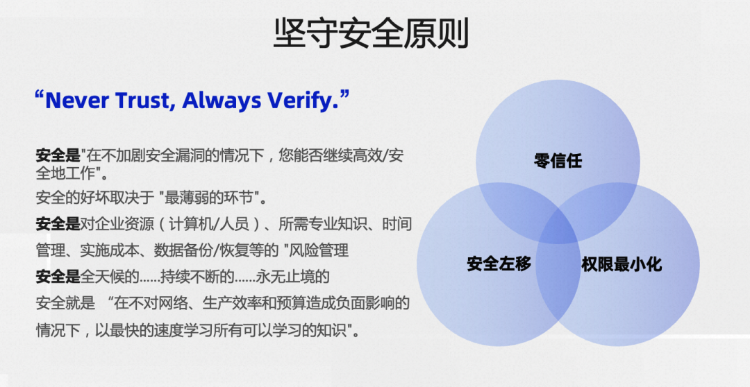 通常来说,我们对于企业安全的定义是是“在不加剧安全漏洞的情况下,您能否继续高效/安全地工作”。保证容器运行时安全需要通过最小化权限、零信任的原则,以 Never trust, always verfy 的方式思考 IT 设施各个组件之间的交互方式,思考计算如何做到零信任。