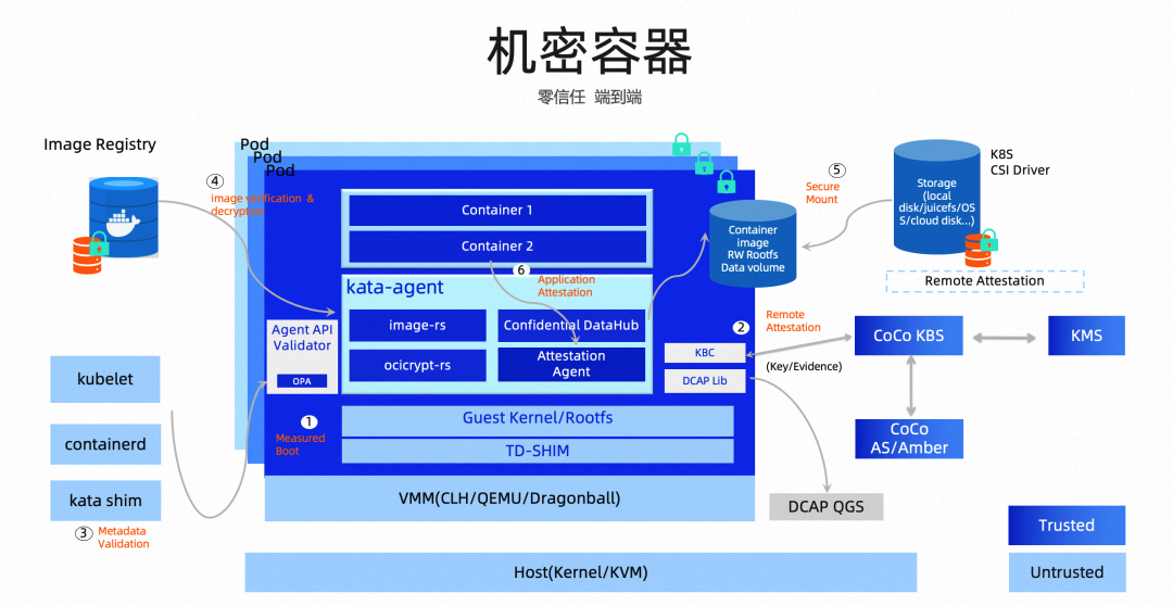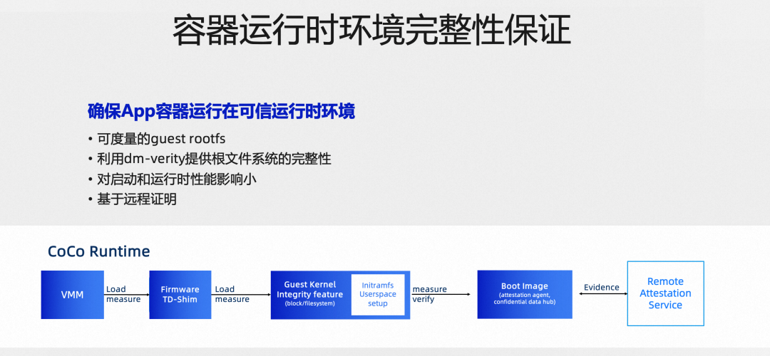 为了确保 App 容器运行在可信运行时环境 不被恶意篡改,安全容器参考架构提供了可度量的 guest rootfs,并利用 dm-verity 通过远程证明服务提供根文件系统的完整性,并且保证了启动性能。