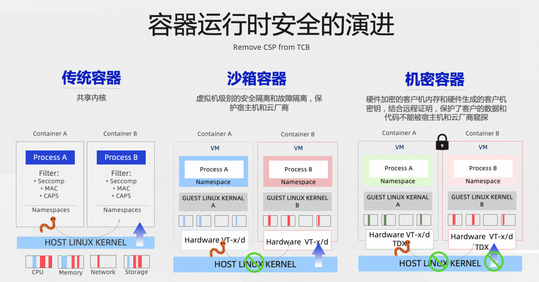 而对于上述第 5 中提到的“提权攻击和内存溢出/数据攻击”, 则需要使用机密虚拟机或者机密沙箱容器来做软硬一体的可信的计算来从根源上治理。