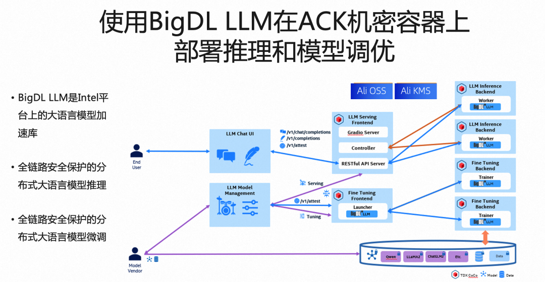 使用 BigDL LLM 在 ACK 机密容器上部署推理和模型调优 ,BigDL LLM 是 Intel 平台上的大语言模型加速库,结合数据加密和阿里云存储和密钥服务,全链路安全保护的分布式大语言模型安全,也可以全链路安全保护的大语言模型微调数据的安全,通过 BigDL 和 ECS 8 代实例实现模型推理和微调的加速。