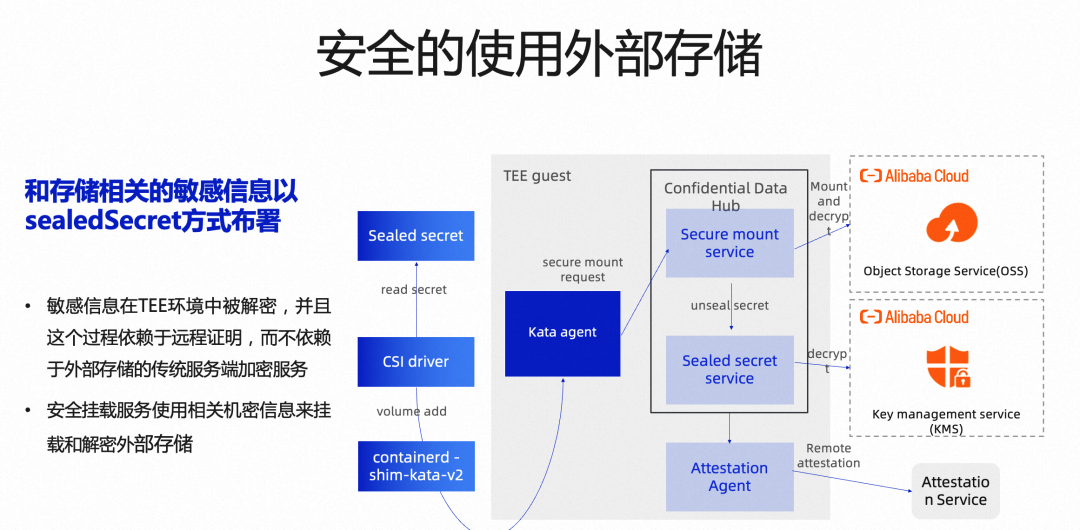 安全的云上存储访问 ,存储相关的敏感信息以 sealedSecret 方式布署,敏感信息在 TEE 环境中被解密,并且这个过程依赖于远程证明,而不依赖于外部存储的传统服务端加密服务,安全挂载服务使用相关机密信息来挂载和解密外部存储。