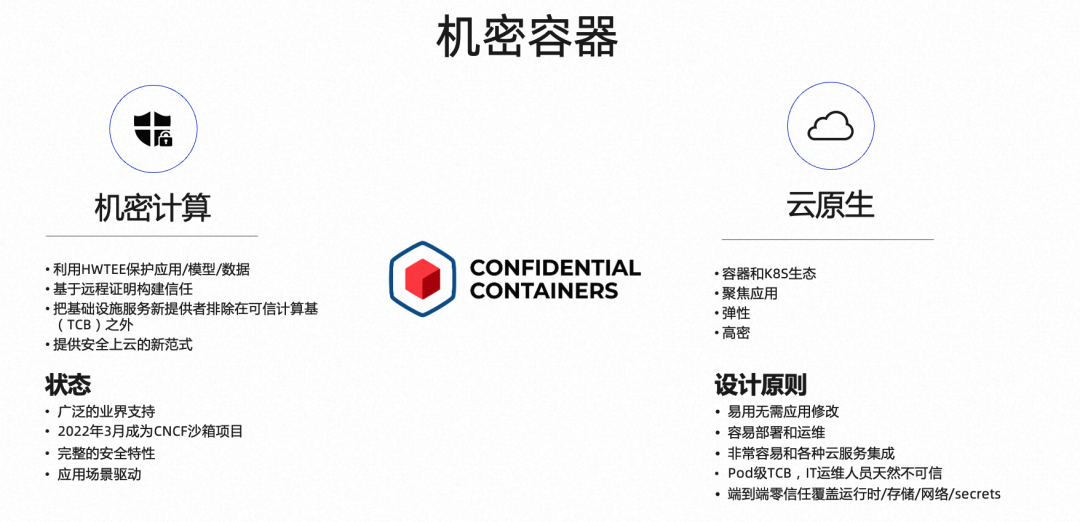 机密容器(Confidential Containers)是云原生基金会(CNCF)旗下的一个沙箱项目,它使用硬件信任执行环境(TEE)为容器化的工作负载提供机密性和完整性。机密容器两大设计原则就是易用和安全。从易用性角度,无缝对接 Kubernetes 和容器生态, 确保应用能够平滑迁移;从安全性角度,机密容器有着更严格的威胁模型,通过提供 Pod/VM 级 TCB,对 IT 运维人员和云厂商也可以做到计算过程的零信任。