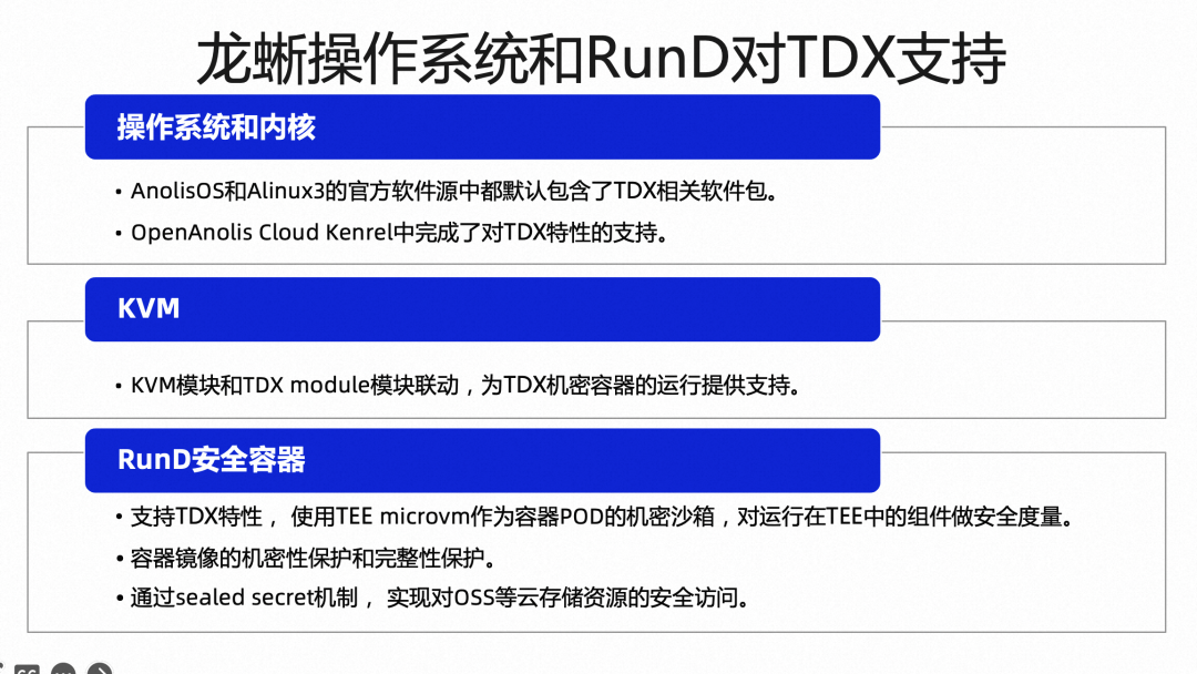 RunD 安全容器是龙蜥社区开源的下一代容器解决方案,包含 Rust Kata runtime 和 Dragonball VMM。RunD 安全容器已经于 2022 年由龙蜥云原生 SIG 开源至 Kata Containers 社区,且作为 Kata Container 3.0.0 release 的重要特性。目前龙蜥社区已经完成 Host OS 、Guest OS 和 RunD 安全容器对 TDX 硬件的支持工作,并提供机密容器解决方案的端到端支持。