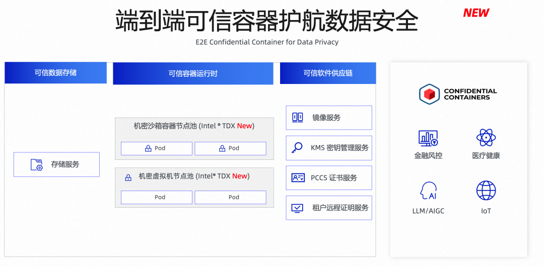 为了解决企业对数据隐私日益关切,阿里云、达摩院操作系统实验室与 Intel 和龙蜥社区一起,推出基于可信执行环境(TEE)的机密计算容器(Confidential Containers,简称 CoCo)在云上的参考架构。企业可以通过容器服务 ACK TDX 机密沙箱容器节点池实现端到端零信任的应用、数据和模型保护。