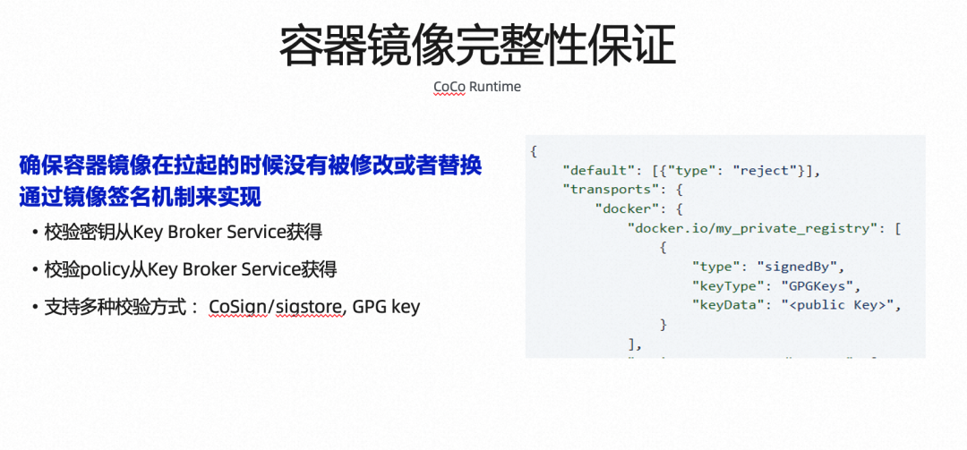 为了确保容器镜像的完整性,确保拉起过程中没有被恶意修改或者替换,使用镜像签名机制完成镜像校验,从 Key Broker Service 获得校验密钥,校验 Policy 并通过 CoSign/sigstore, GPG key 等方式校验镜像的完整性。