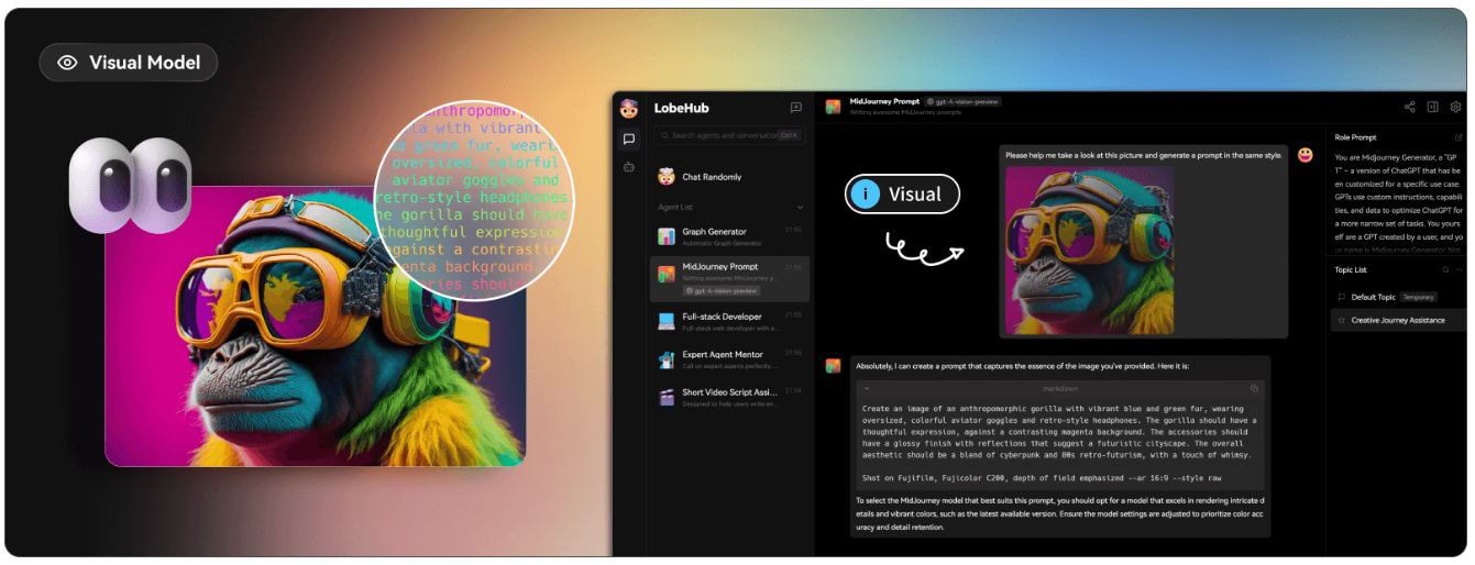 LobeChat 已经支持 OpenAI 最新的 gpt-4-vision 支持视觉识别的模型,这是一个具备视觉识别能力的多模态智能。 用户可以轻松上传图片或者拖拽图片到对话框中,助手将能够识别图片内容,并在此基础上进行智能对话,构建更智能、更多元化的聊天场景。