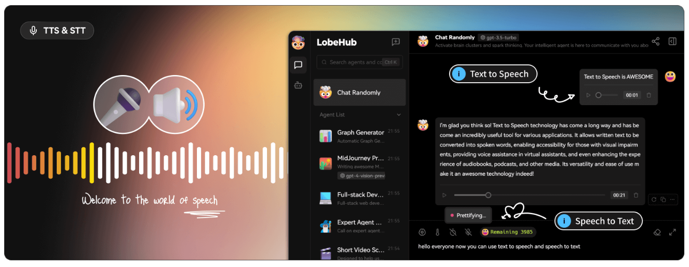LobeChat 支持文字转语音(Text-to-Speech,TTS)和语音转文字(Speech-to-Text,STT)技术,能够将文本信息转化为清晰的语音输出,用户可以像与真人交谈一样与我们的对话代理进行交流。 用户可以从多种声音中选择,给助手搭配合适的音源。 同时,对于那些倾向于听觉学习或者想要在忙碌中获取信息的用户来说,TTS 提供了一个极佳的解决方案。